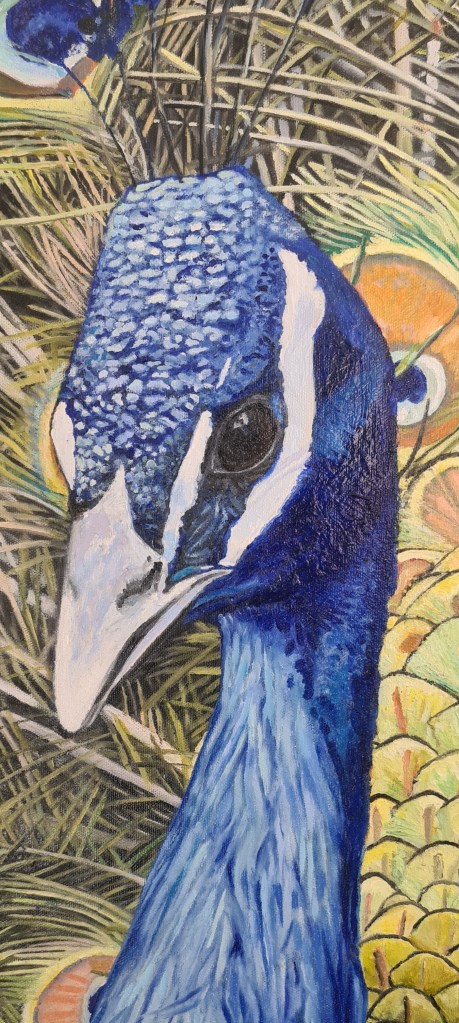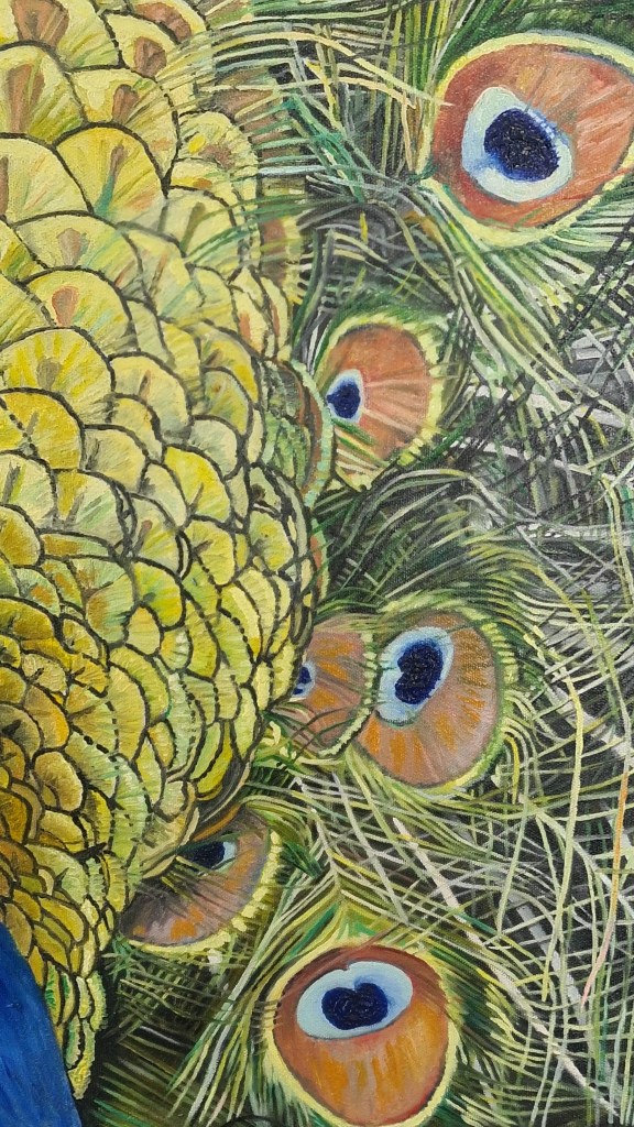 Quelque temps après, je me suis lancé dans un projet mûrement réfléchi… Peindre à l’huile un paon, sur une grande toile (1 m sur 1,30 m). J’avais trouvé un beau modèle sur le Web, mais également en complément beaucoup d’autres images. J’avais pu voir aussi l’oiseau parader, se déplacer, ses plumes, leurs structures.