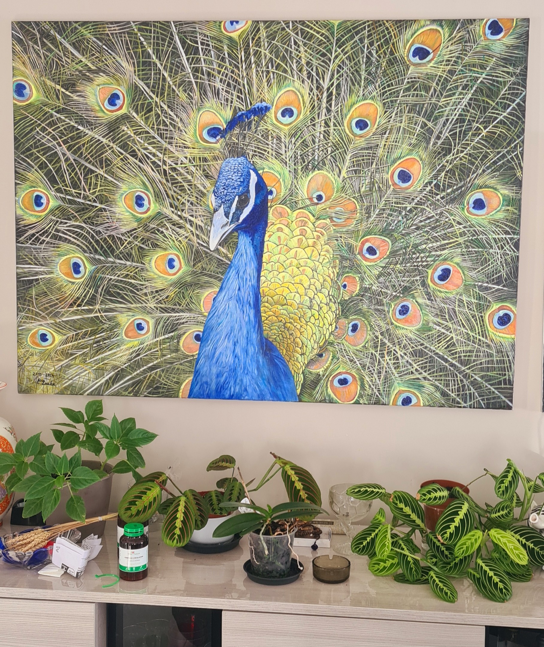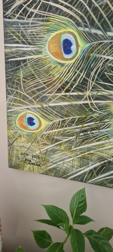 J’ai commencé le 24 décembre 2019. Et, puis, sur des journées, des nuits entières, quand j’avais le temps, l’énergie et l’inspiration nécessaires pour m’y consacrer, après de 300 à 400 heures de coups de pinceaux, de nombreuses tentatives de mélange de couleurs pour trouver la bonne teinte, d’échecs et de retouches… étalés sur 5 ans, beaucoup de persévérance mais tellement d’excellents moments de conception, de détente, centrés sur cet objectif, le 11 décembre 2024, je l’ai verni. Voici le Paon.